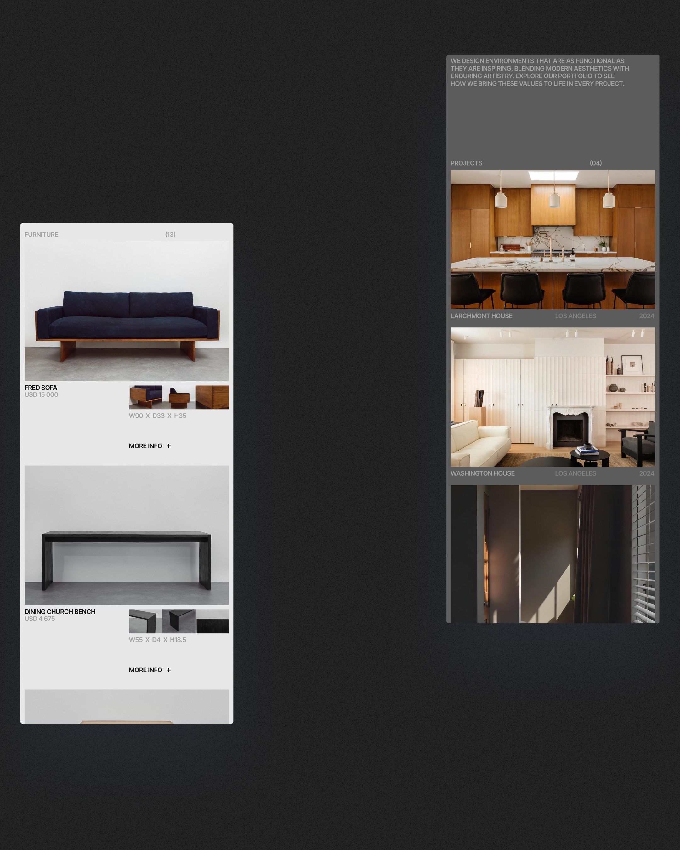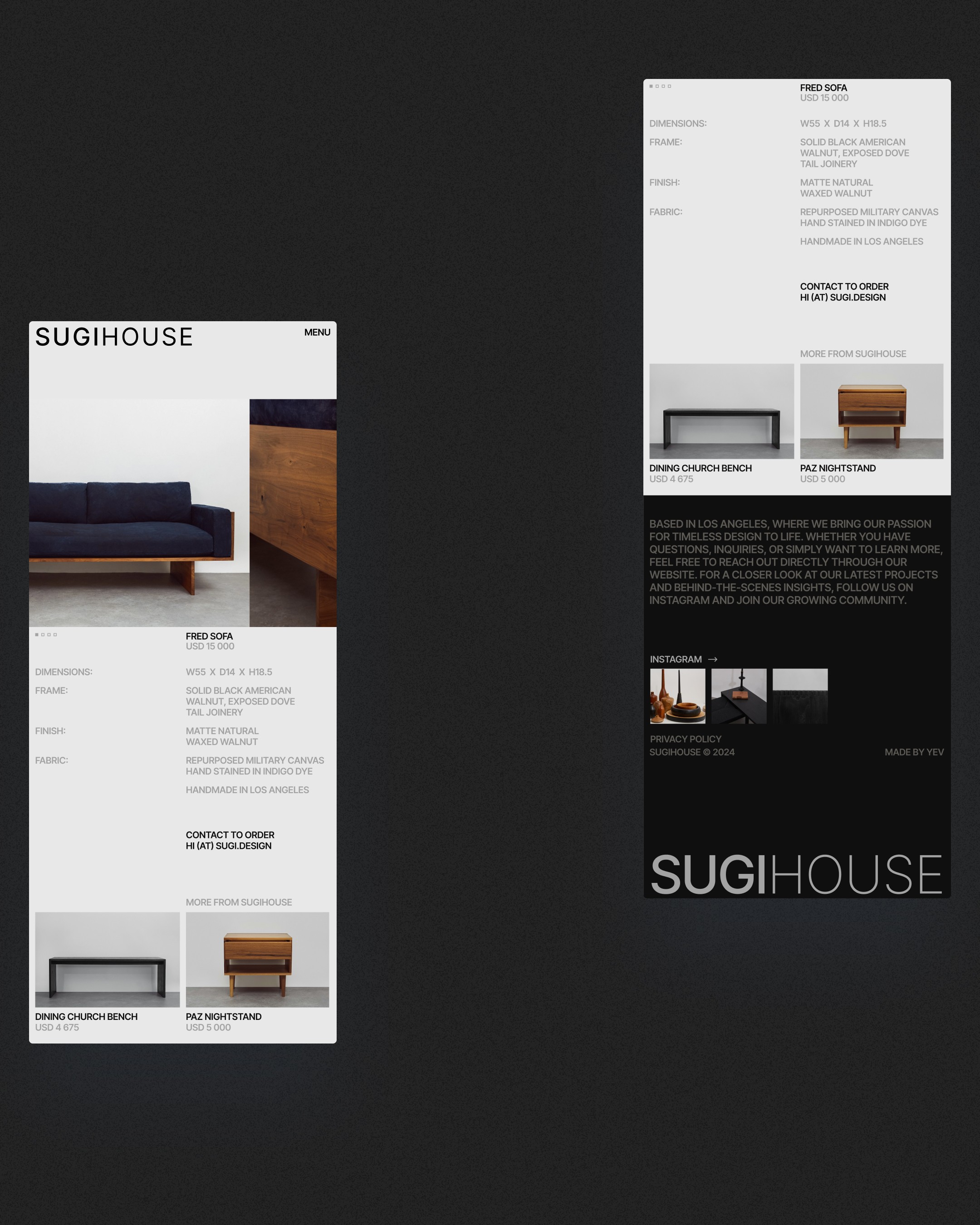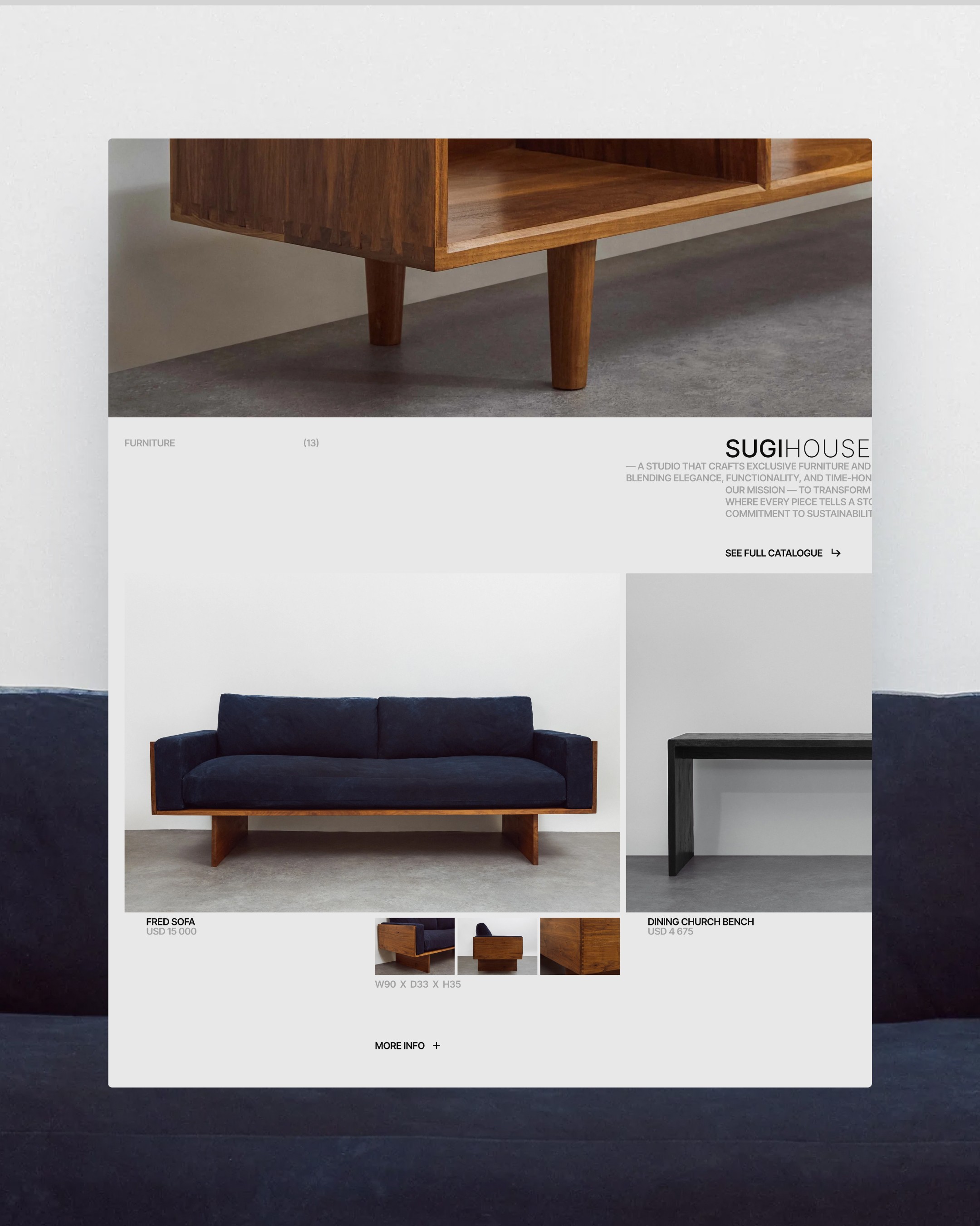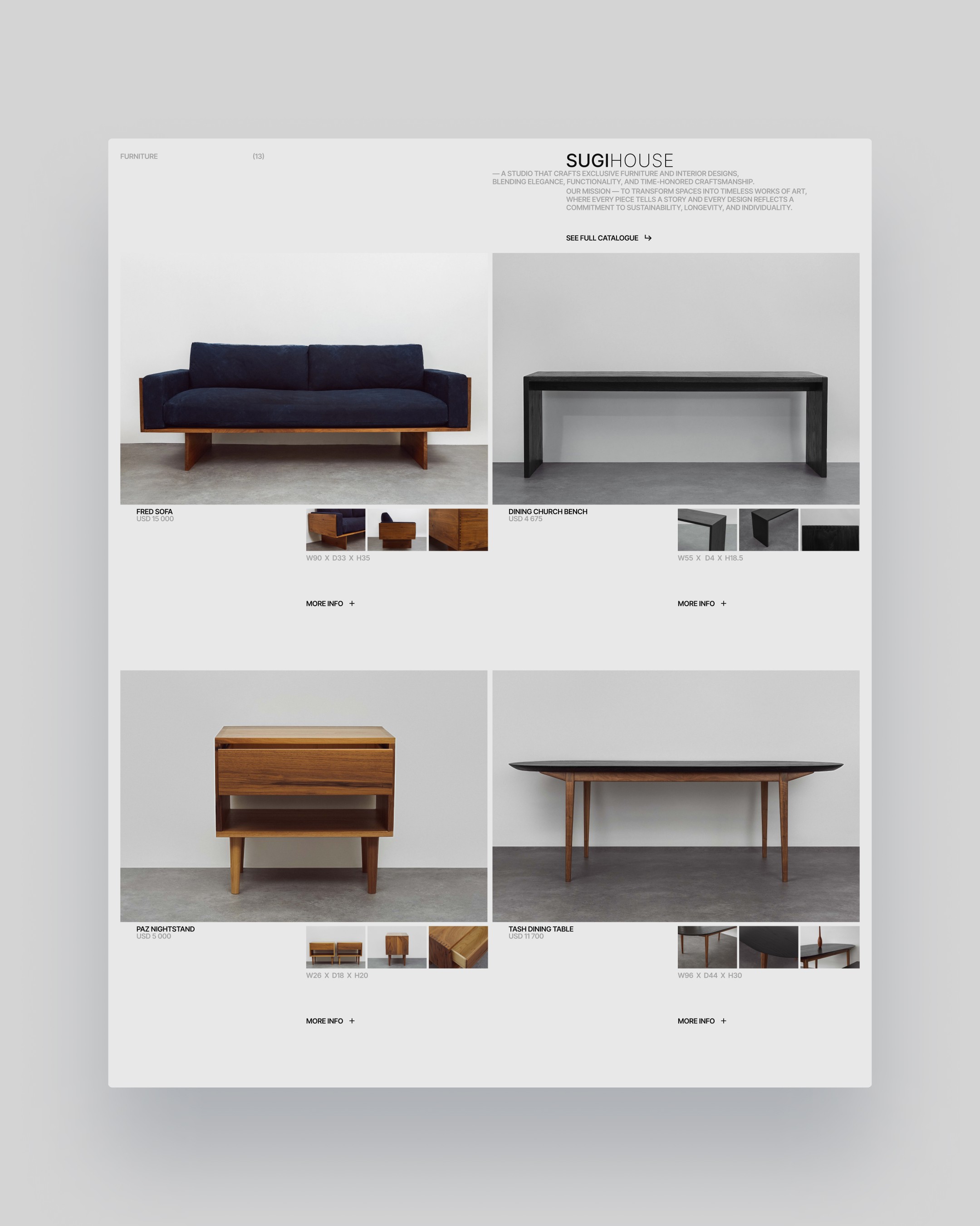 Visually, the site was stripped down to the essentials. I designed a system that lets the work breathe—clean layouts, generous negative space, and refined type choices that frame each piece like a gallery object. The result is a slower, more tactile web experience that mirrors the philosophy behind the furniture itself: thoughtful, timeless, and built to last.